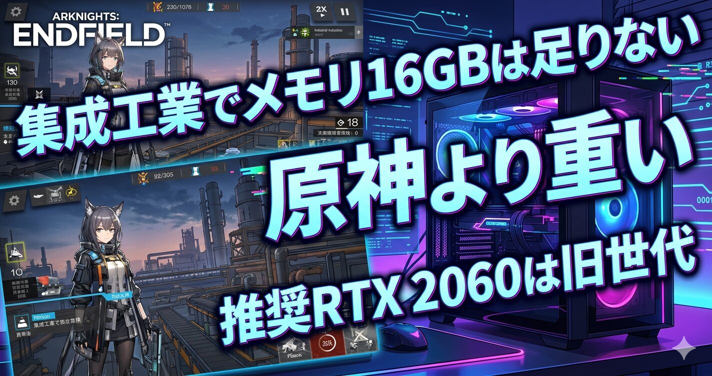 エンドフィールドの工業要素に本気で取り組む場合、公式推奨スペック(RAM 16GB・RTX 2060)はゲームの核心機能を快適に動かすには不十分な可能性があります。工場シム要素を楽しみたいなら、最低でも「RAM 32GB・RTX 5060 Ti以上・Ryzen 7以上」の構成を起点に考えることを推奨します。