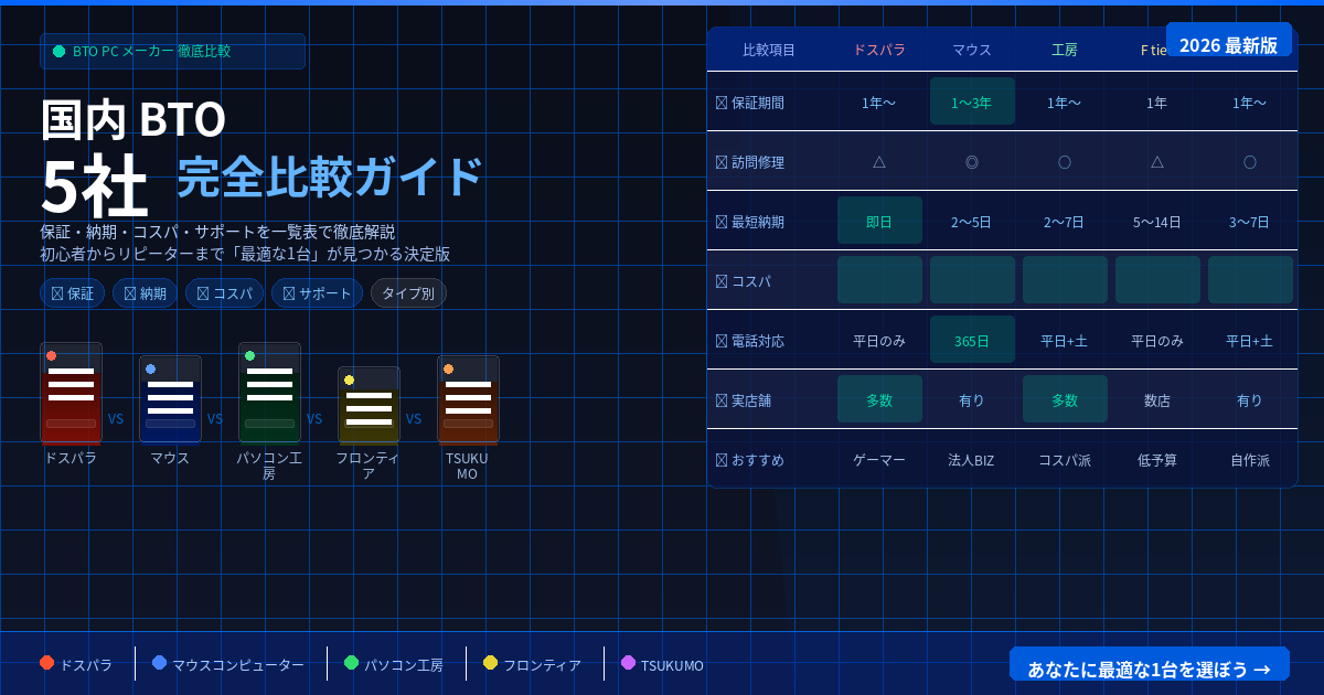 ✅ 主要5社(ドスパラ・マウス・パソコン工房・フロンティア・TSUKUMO)の特徴・強みを比較