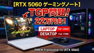 ①同じRTX 5060でもTGP次第で30%性能差、②デスクトップとの正直比較(据え置きはデスクトップ一択)、③シングルチャンネルRAMの帯域半減問題、④排熱設計と長時間ゲーム時のfps低下、⑤週の持ち出し回数で決まる選び方を解説——22〜27万台おすすめ3選。