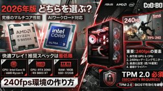 2026年版Ryzen 9 9950X vs Core Ultra 9 285K比較。①タイトル別fps差(最大30%)②E-Coreの使いどころ③年間電気代5,000円差の実計算④BTO購入時のシステム価格差⑤AM5 vs LGA1851の将来性——5視点の正直評価でゲーミングPCのCPU選びに結論を出す。おすすめBTO3選を解説。