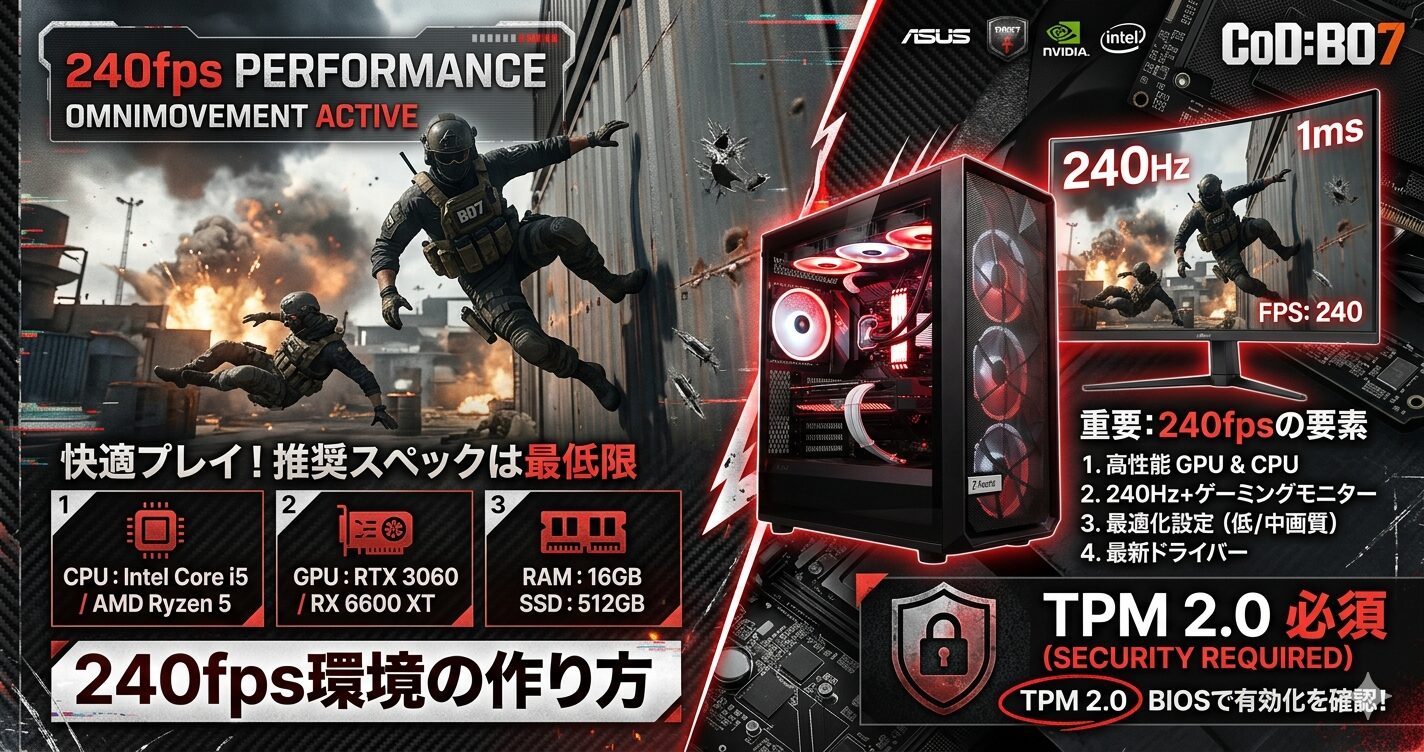 CoD:BO7は「シリーズで最もフレームレートにシビアなCOD」です。ウォールジャンプ・オムニムーブメントという新機能が加わったことで、競技プレイヤーが求めるfps帯は240fps・360fpsへと高まっています。さらにRICOCHET(アンチチート)がTPM 2.0・セキュアブートを必須化しており、古いPCや一部の自作PCでは起動すらできないという落とし穴もあります。