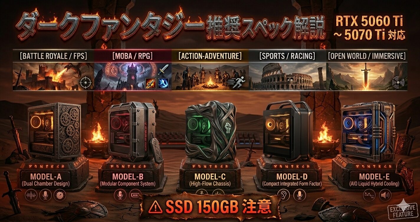 | RTX 5060 Ti以上(高設定) | RTX 5060 Ti(16GB) | フルHD高設定・WQHD/60fpsが目安 |