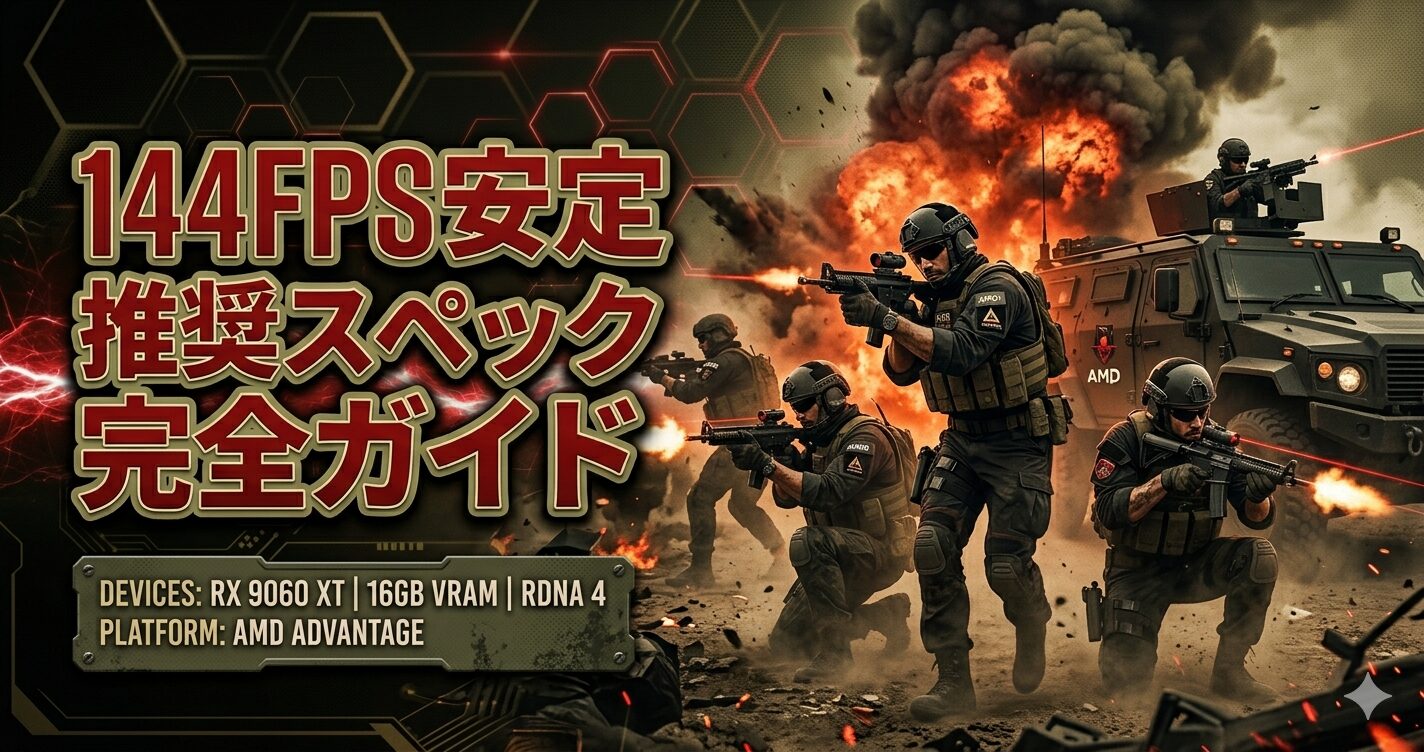 | 高設定・実戦快適ライン | Win11 64bit | Core i5-12400F / Ryzen 5 5600X | RTX 5060 / RX 9060 XT | 16GB DDR5 | 8GB | 1TB NVMe Gen4 | 100〜144fps(高設定) |
