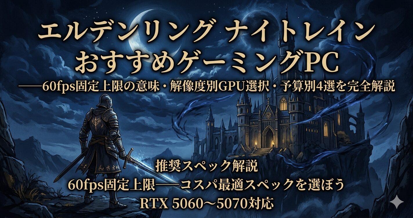 「エルデンリング ナイトレインはどんなゲーミングPCが必要か?」——この記事ではフロム・ソフトウェア公式発表のスペックをもとに、予算別おすすめBTOゲーミングPCを解説します。また、競合記事がほぼ触れない「フレームレートが60fps固定上限」というナイトレイン特有の仕様も詳しく解説します。