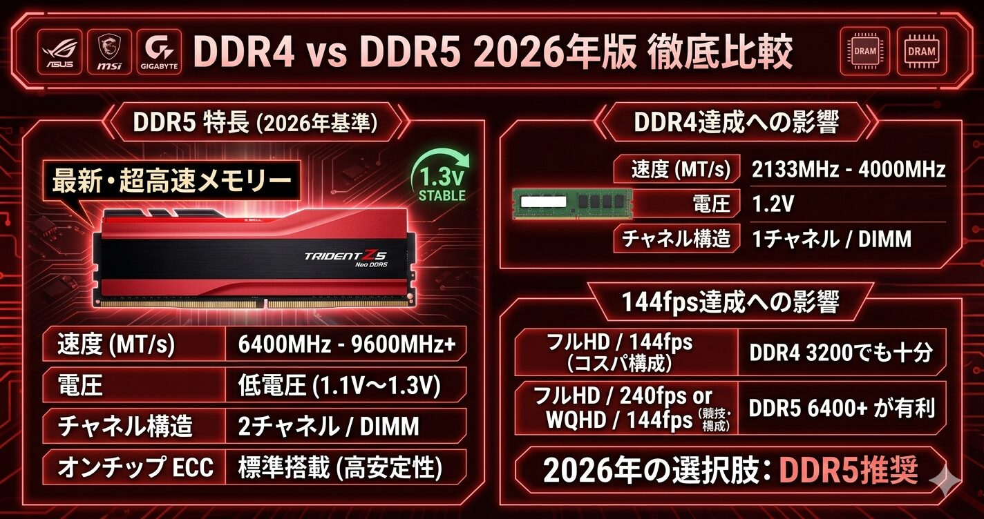 | ✅ 2026年の選択結論 | 新規購入ならDDR5対応PC一択。「DDR5-6000 CL30 32GB(16GB×2)」が最良バランス |