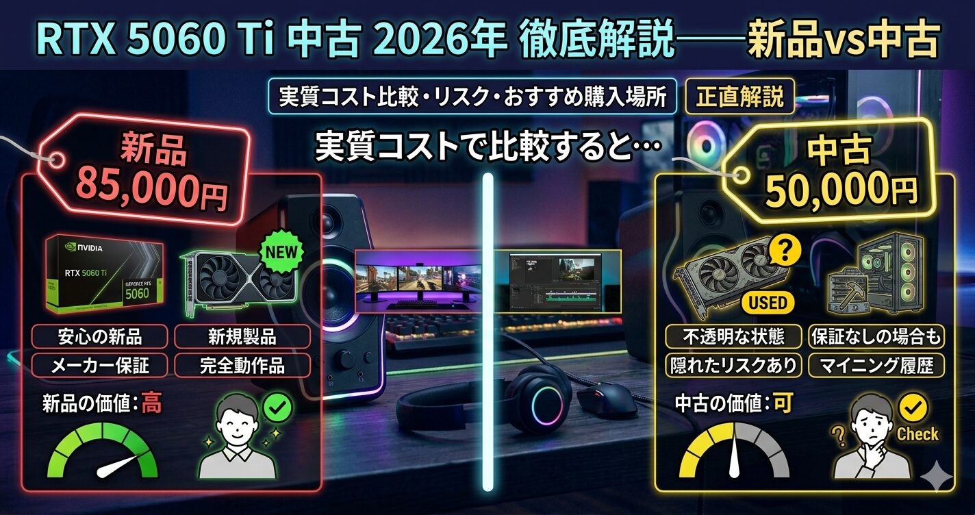 しかし正直に言います。「安ければ中古で買い」とは限りません。RTX 5060 Tiには8GB版と16GB版の混在問題、DLSS 4.5のメリットを活かせる年数の問題、そして中古GPU特有のリスクが重なっています。この記事では「新品 vs 中古」のコスパを電卓を叩いて正直に計算し、中古で後悔しない選び方を徹底解説します。