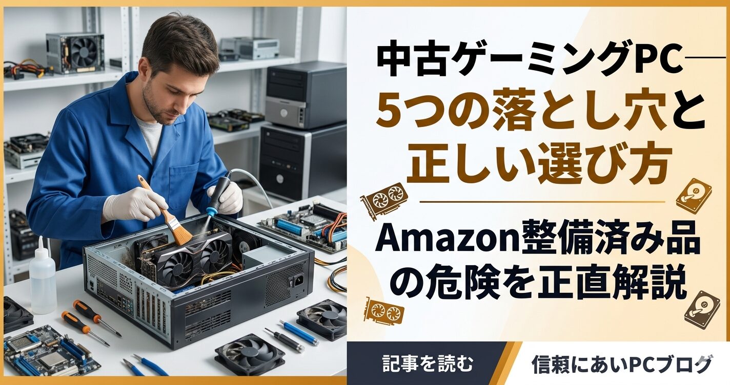 この記事では5つの独自視点で中古ゲーミングPCの真実を解説します。①Amazonやヤフショに横行する「ビジネスPC後付けグラボ詐欺」の見抜き方②Amazon整備済み品が抱える3つの構造的リスク③「RTX 3060は2026年でも現役か」という買い時の考え方④購入後に必ずやること5選⑤新品との総コスト(TCO)正直比較——これらを正確に理解した上で、正しいショップから中古を買えれば同スペックの新品より4〜7万円安く、かつ安心して使える環境が手に入ります。