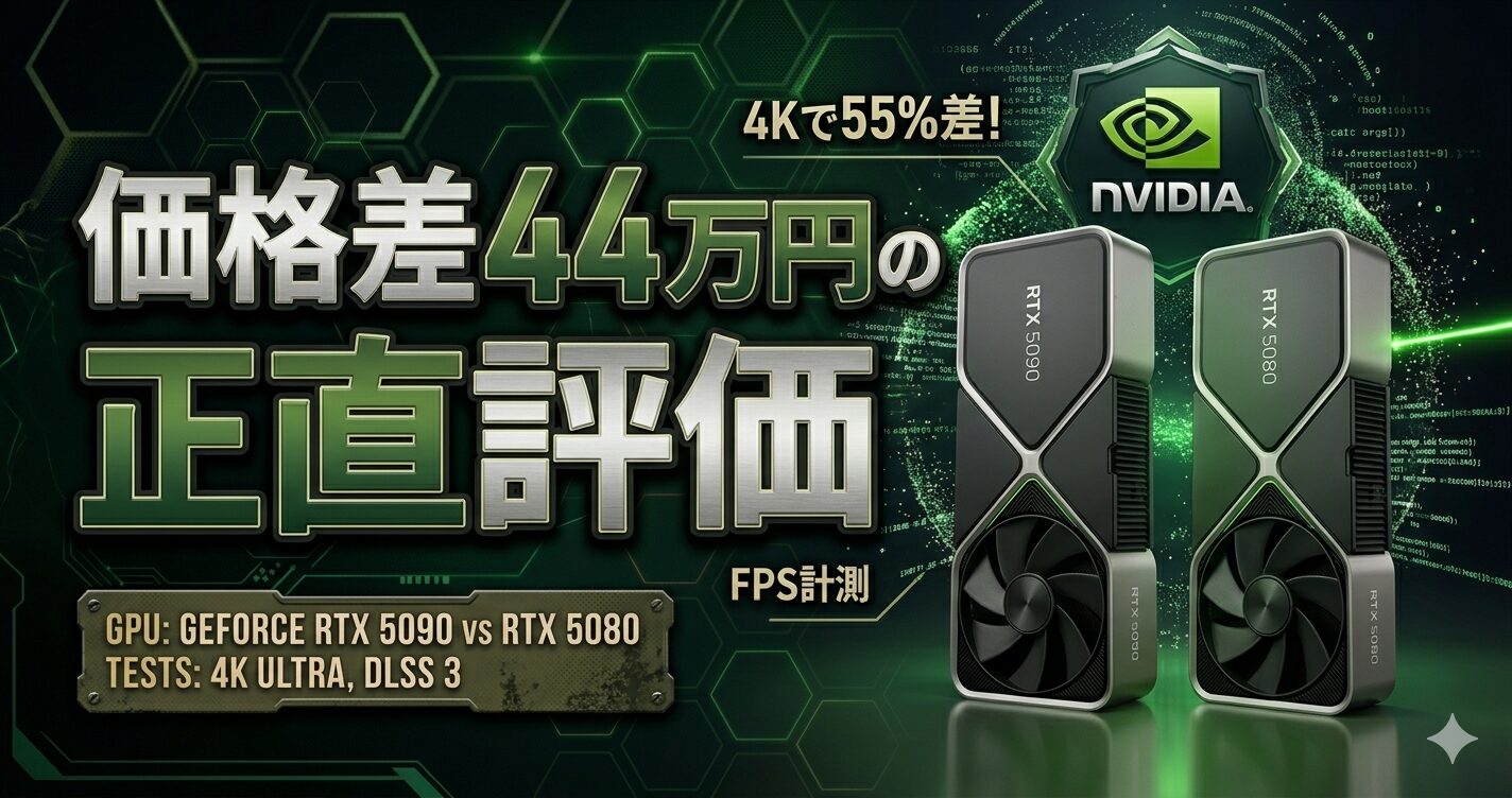 2026年4月現在、RTX 5090搭載BTO最安は税込749,800円、RTX 5080搭載BTO最安は税込349,980円。価格差は約40万円——しかし4K・最高設定でのfps差はおよそ35〜55%です。この差額40万円を「fpsの差」で正当化できるのかどうかが、この比較記事の核心です。