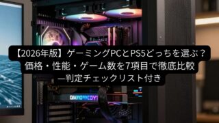 ゲーミングPC基本情報 【2026年版】ゲーミングPCとPS5どっちを選ぶ?価格・性能・ゲーム数を7項目で徹底比較——判定チェックリスト付き 2026年3月版。PS5(55,000円〜)とゲーミングPC(約16万円〜)を価格・性能・タイトル数・使い勝手・PS Plus費用・長期コストの7項目で徹底比較。PS5 Proとの性能差も正直評価。「PS5がおすすめな人」「ゲーミングPCがおすすめな人」の判定チェックリスト付き。両方持ちの使い分け方も解説。 2026.03.18 ゲーミングPC基本情報