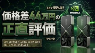 RTX 5090 vs RTX 5080を2026年最新データで正直比較。①4Kで55%・WQHDで35%の fps差、②BTO価格差約40万円+5年電気代差4万円の実質44万円差、③VRAM 32GB vs 16GBの将来価値、④DLSS MFG後も変わらないコスパ優劣——どちらを選ぶべきか完全解説。